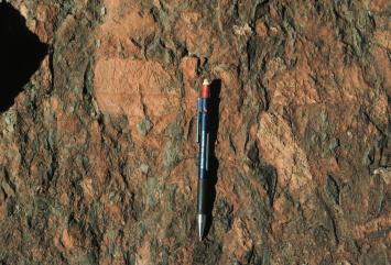 Zones carbonates (orangé, volcanoclastites) et non-carbonatées (vert, basaltes).
